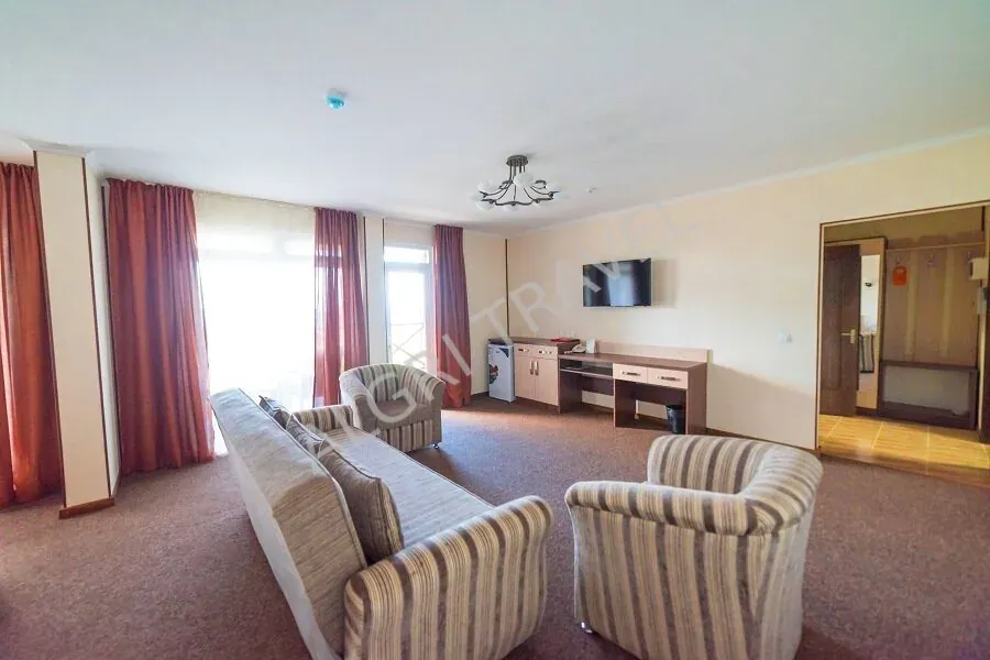 Suite — просторный однокомнатный двухместный номер повышенного комфорта. В комнате предусмотрены отдельная спальная зона и гостиная зона с мягкой мебелью.