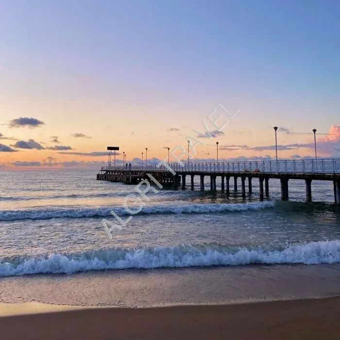 В 150 метрах от песчаного пляжа. На пляже - пирс, грибки от солнца, качели. Есть водные развлечения , катамараны, катера, парашют.