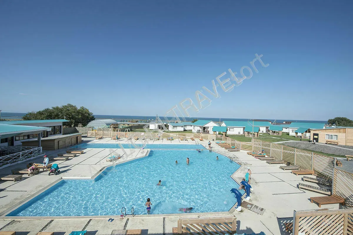 Озелененная и круглосуточно охраняемая, с детскими игровыми площадками, летним кинотеатром, а также обсерватория . На территории отеля в сезоне 2026 года будут функционировать 2 открытых подогреваемых бассейна для взрослых и детей и один крытый. Для удобства ходит бесплатный паром по графику до косы. Имеется камера хранения , медпункт, авто-стоянка, детский клуб, Wi-Fi.