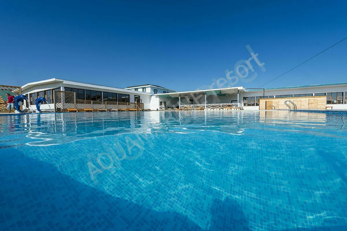 3 подогреваемых бассейна - первый бассейн ~5 метров* ~25 метров, второй бассейн в виде изогнутой чаши, объемом 250 кубометров и имеющий разную глубину, но предназначен, в основном для детей и крытый.