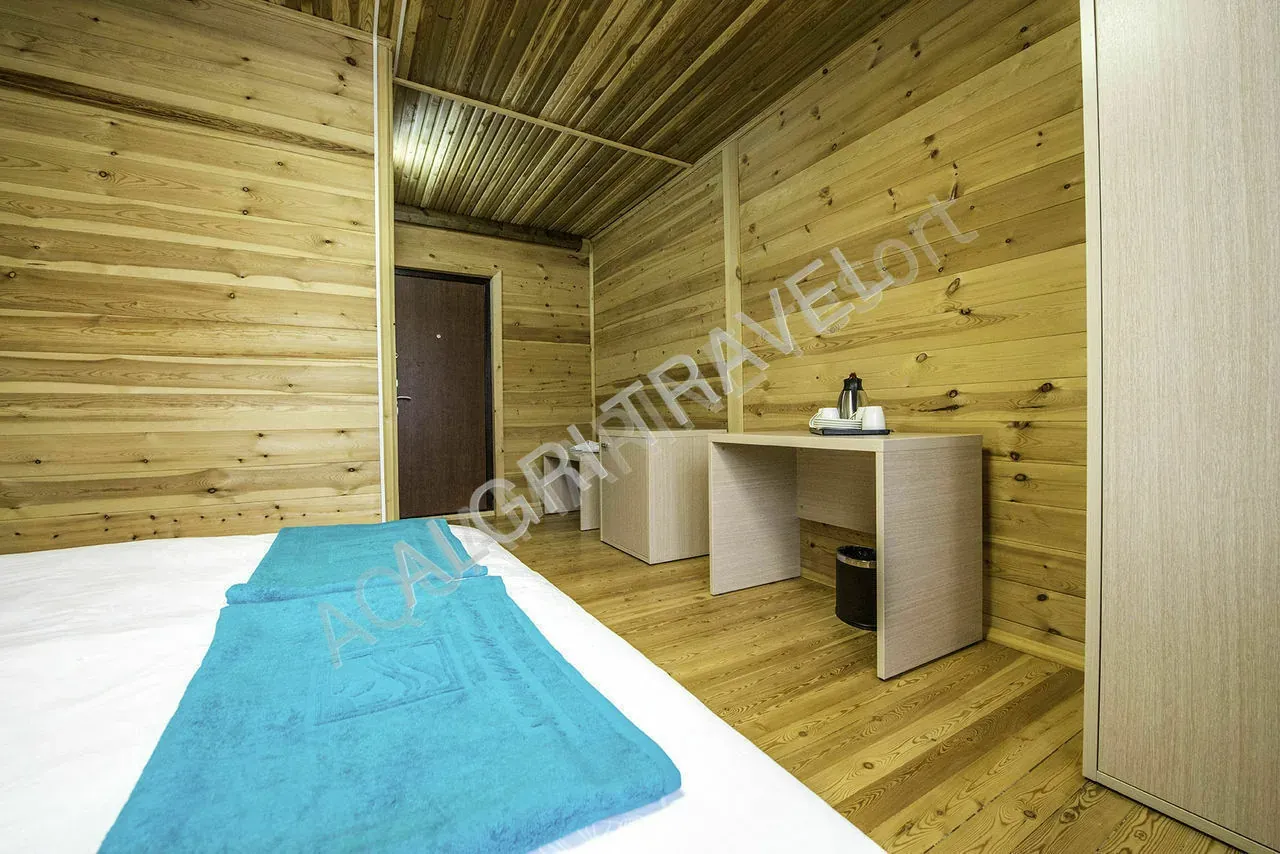 Состоят из трёх комнат: две спальни по 2 человека и гостиная (диван на двоих и раскладное кресло). Два санузла, мини-кухня (приготовление пищи не разрешено, домики деревянные). Основных мест — 4, цены указаны за 4 человека.