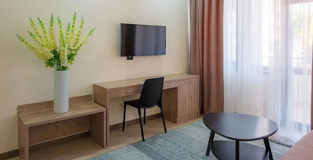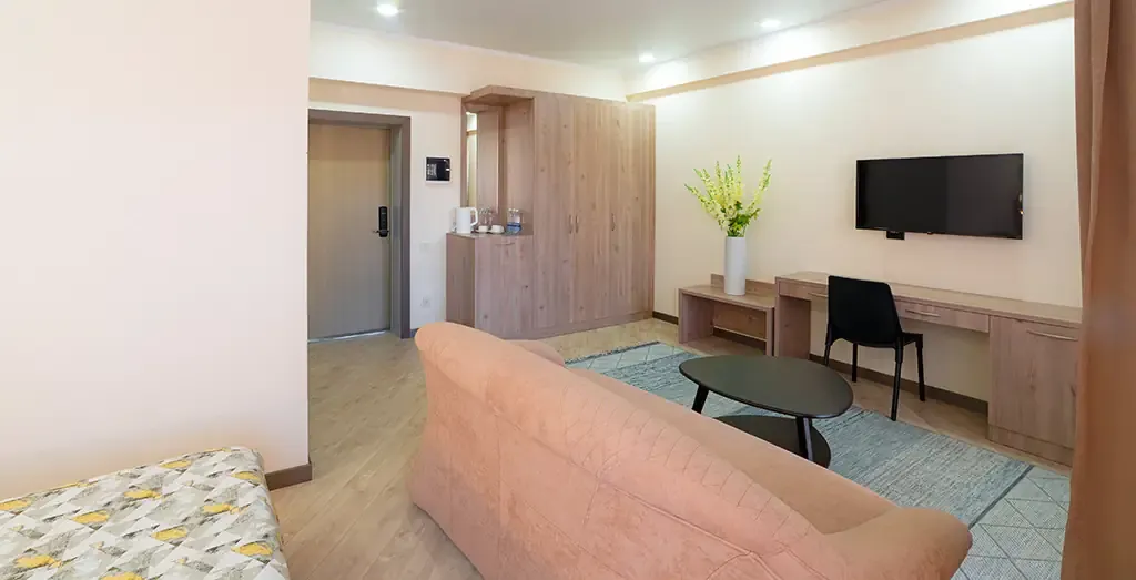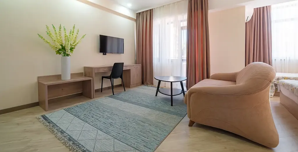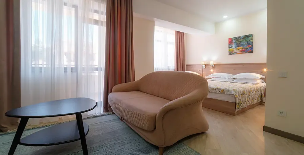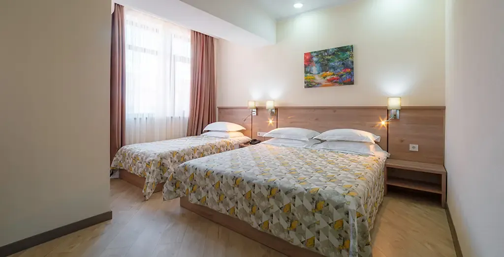 Светлый и уютный семейный номер, идеально подходящий для комфортного размещения трёх гостей. Интерьер выполнен в натуральных оттенках с акцентом на современный европейский стиль, создающий атмосферу уюта и спокойствия.