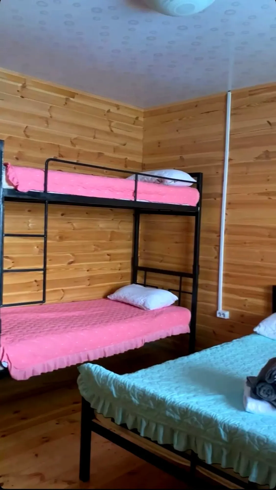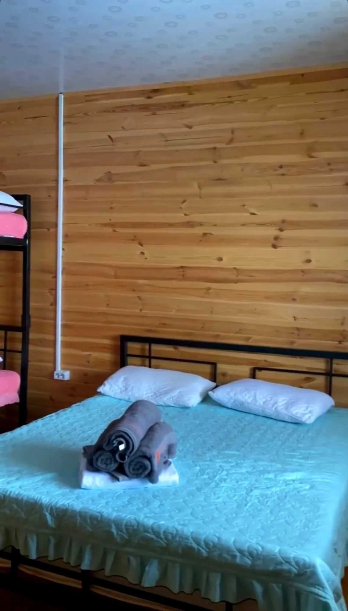 Номер однокомнатный и включает спальную зону с двуспальной кроватью размером 160×200 см и двухъярусной кроватью, что особенно удобно для размещения семьи с детьми.