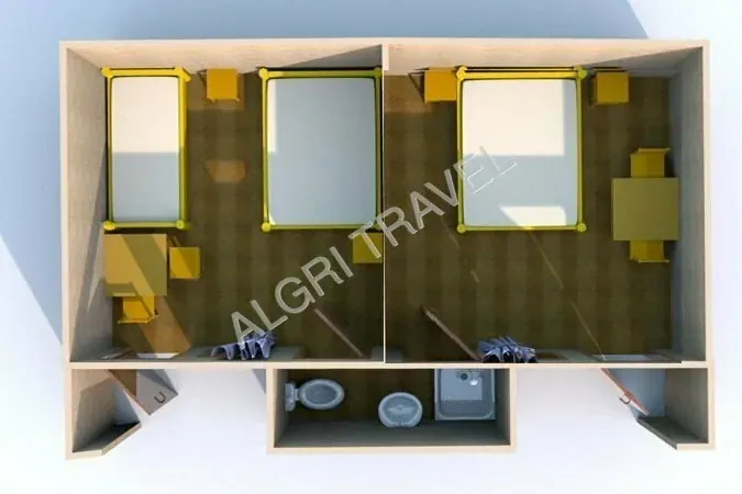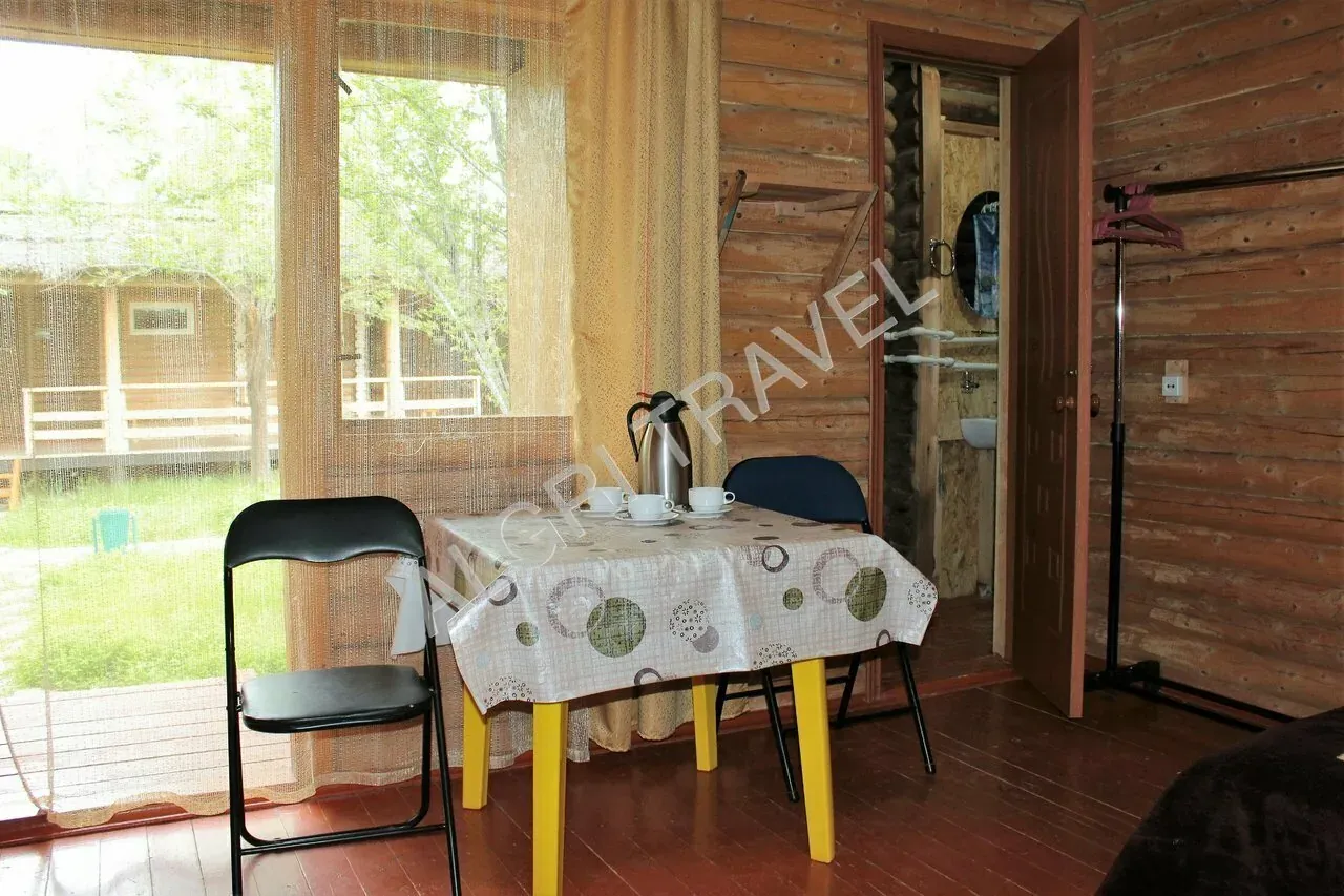 Двухкомнатный 5-ти местный номер в общем корпусе-срубе. В номере в первой комнате двуспальная и односпальная кровати, во второй- двуспальная кровать, стол, стулья, тумба, набор чайной посуды, термос, вентилятор, санузел с душем на номер. Площадь номера 38 м.кв.
