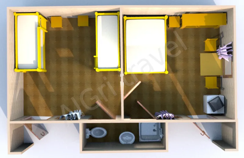 Двуспальная и две двухъярусные кровати, холодильник, сплит-система в 1 комнате, ТВ, стол, стулья, шкаф, стеллаж, набор чайной посуды, термос, собственный санузел с душем. Площадь номера 38 м.кв. Дополнительное место не предусмотрено.