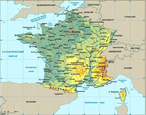 Страна граничит со странами Европейского Союза( Бельгией, Люксембургом, Германией, Италией, Испанией), а также со Швейцарией, Андоррой и Монако, а туннель под Ла -Маншем соединяет ее с Великобританией. На западе Франция омывается Атлантическим океаном (Бискайский залив и пролив Ла-Манш), а на востоке Средиземным морем.