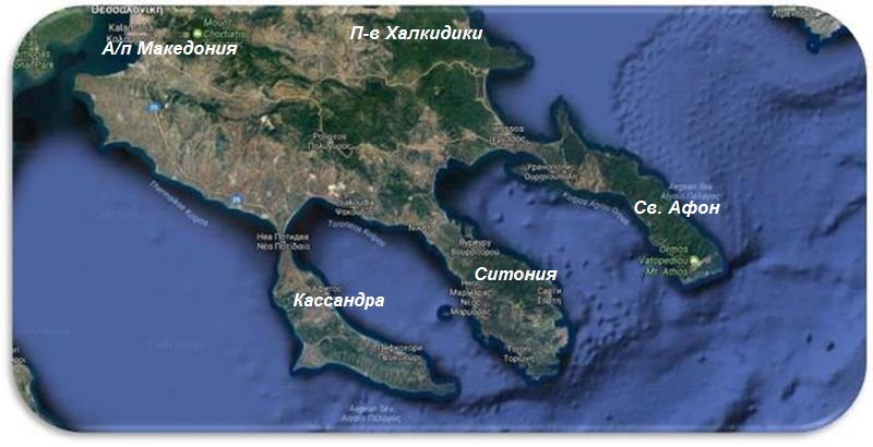 Полуостров Халкидики состоит из трёх частей: Кассандра, Ситония и Афон. На карте эти районы образуют трезубец. |