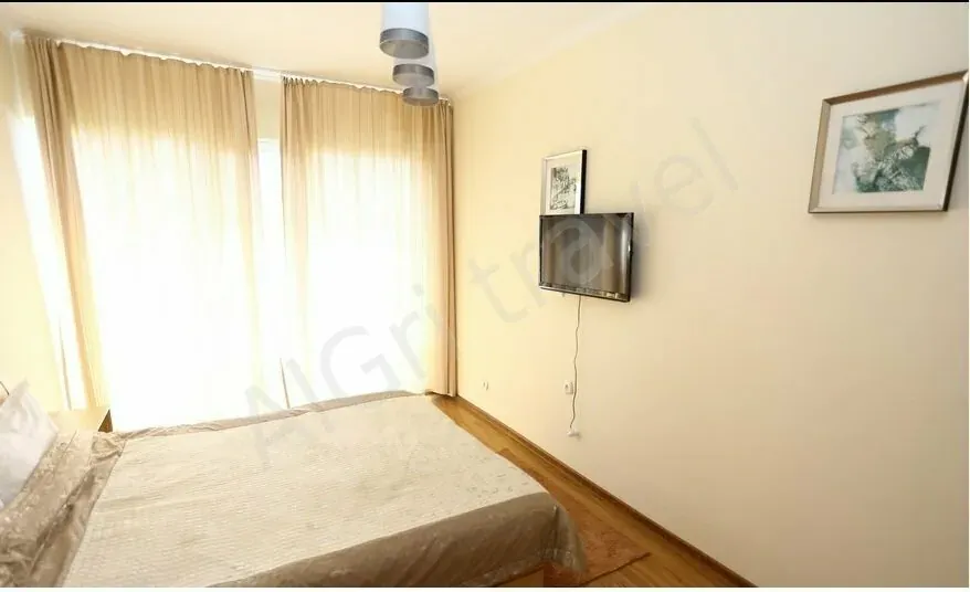Состоит из двух комнат - спальня и гостиная. В гостиной - диван раздвижной, кухонный гарнитур, холодильник, телевизор. В спальне - двуспальная кровать, раздвижной маленький диванчик, телевизор. Ванная комната - г/х вода, душевая кабина, туалет. Фото и подробности
