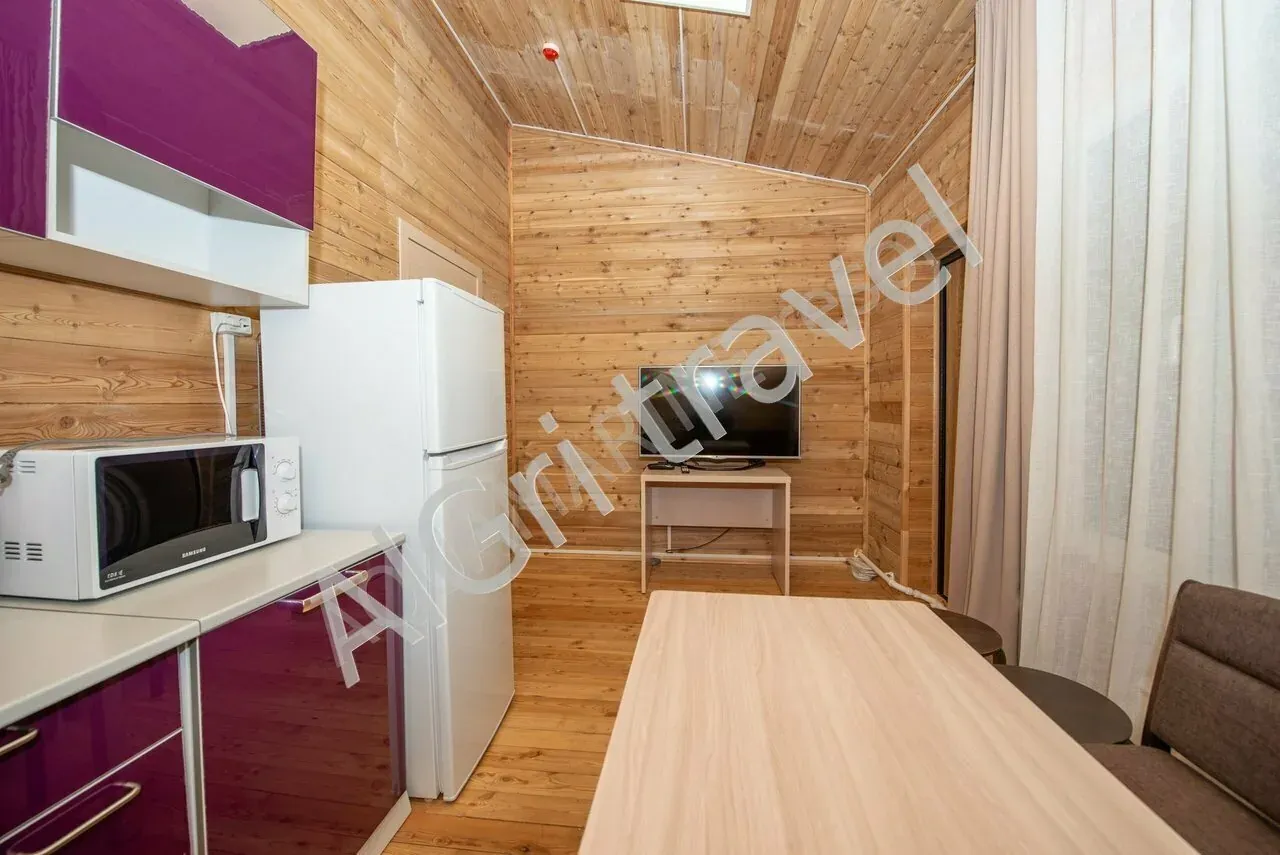 Гостиная оборудована кухонным уголком с набором посуды, большим холодильником, плоским телевизором, электрочайником и микроволновой печью. Санузел с душевой кабиной, фен.