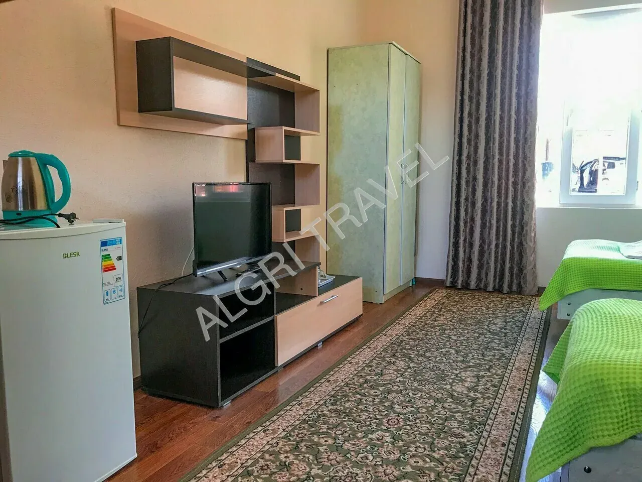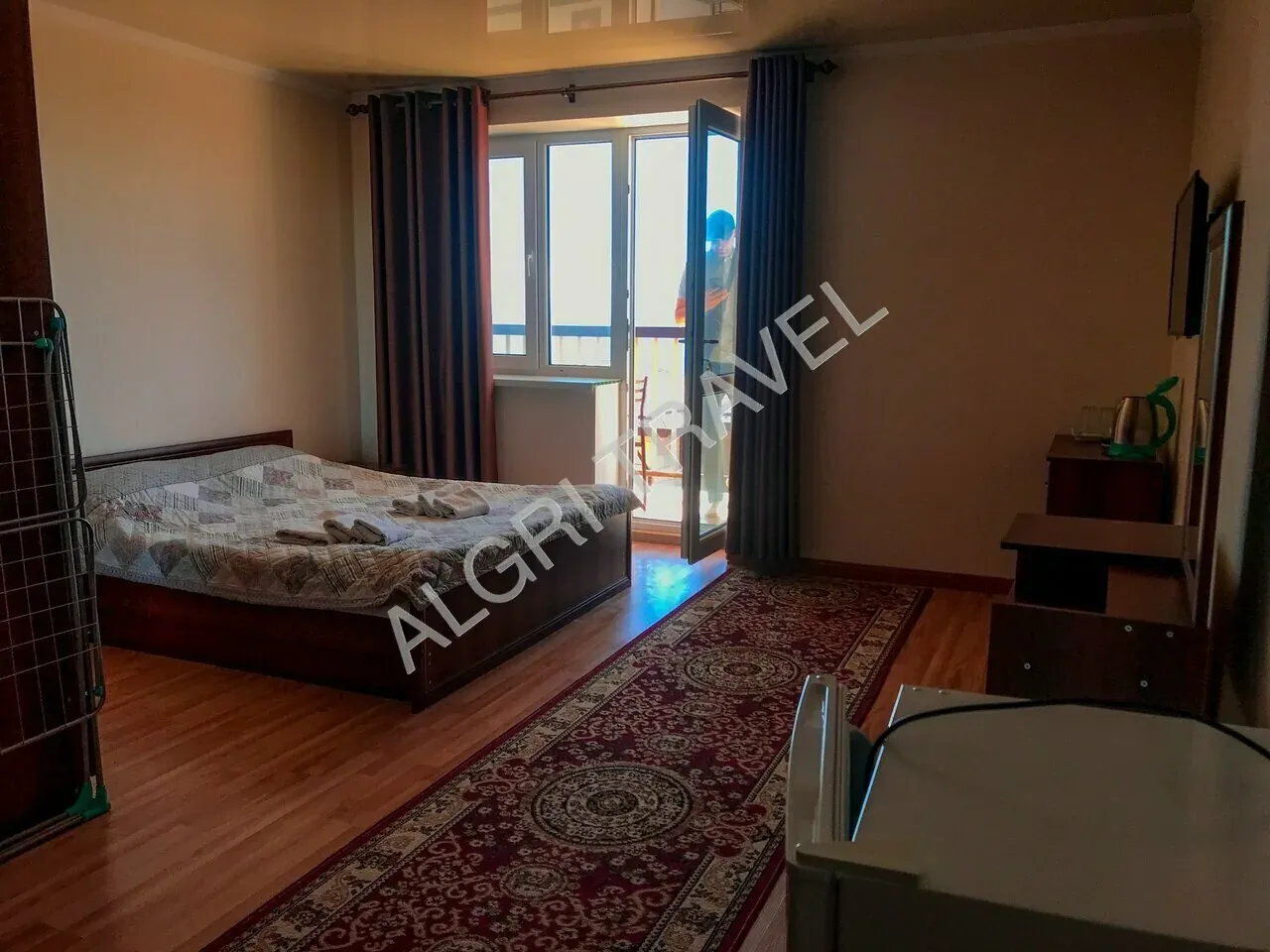 2хкомнатный номер состоит из спальни и гостиной. Расположен в 4хэтажном корпусе на первом этаже. В номере двуспальная кровать, шкаф, кухонная мебель, чайник, набор посуды, санузел с душем