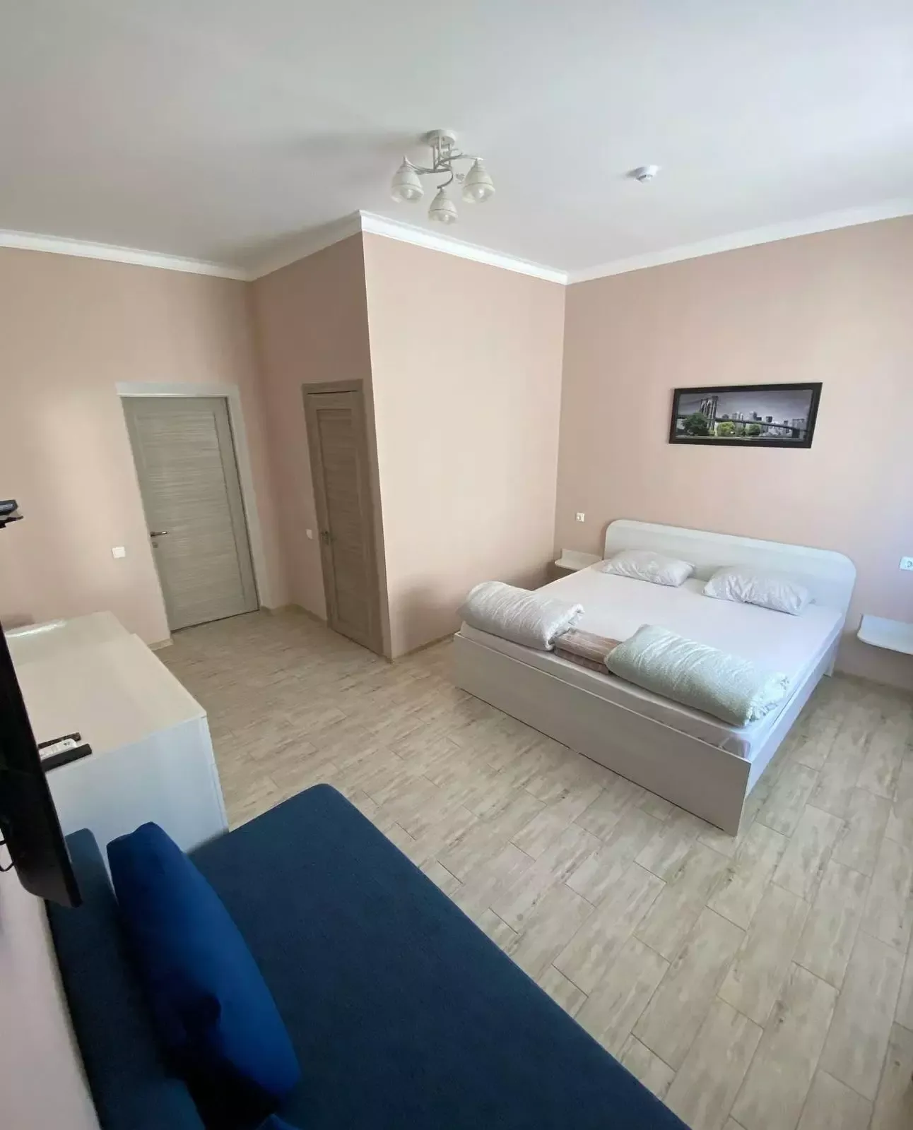 Номер однокомнатный, расположен в корпусе и рассчитан на комфортное проживание. В комнате установлена двуспальная кровать, а также раскладной диван, который может использоваться как дополнительное спальное место.