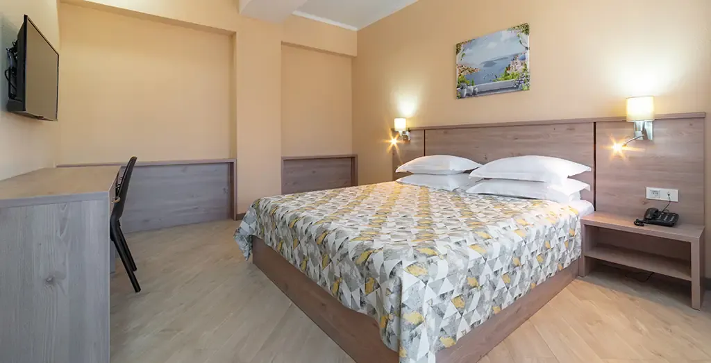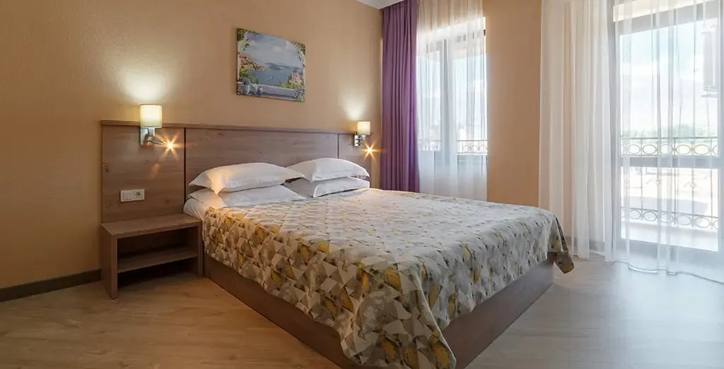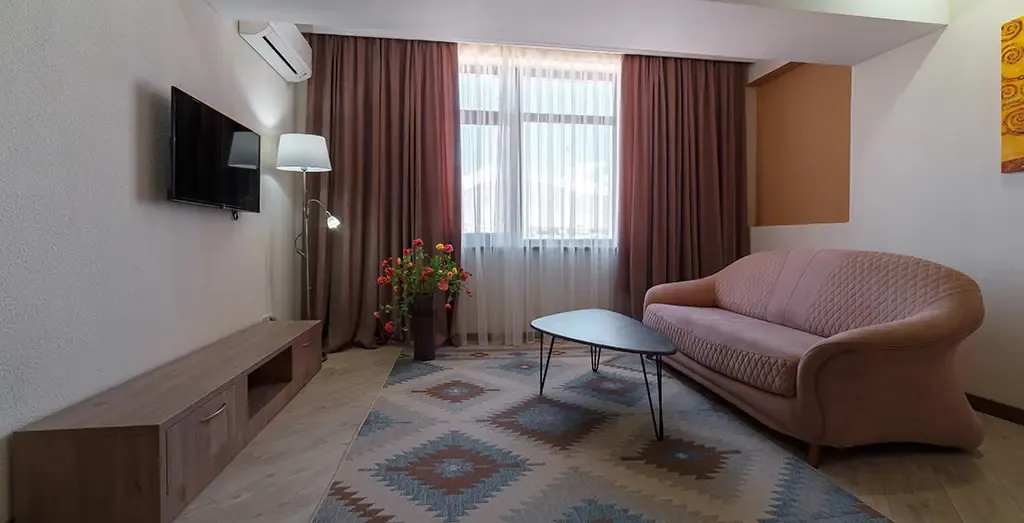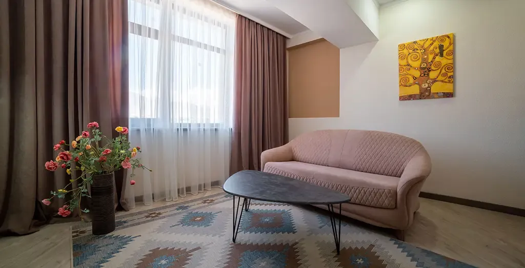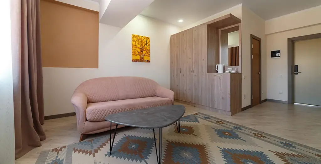 Светлый и просторный двухкомнатный номер, оформленный в натуральных оттенках с элементами современного европейского стиля. Интерьер продуман так, чтобы создать атмосферу уюта и расслабленного отдыха.