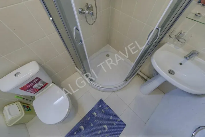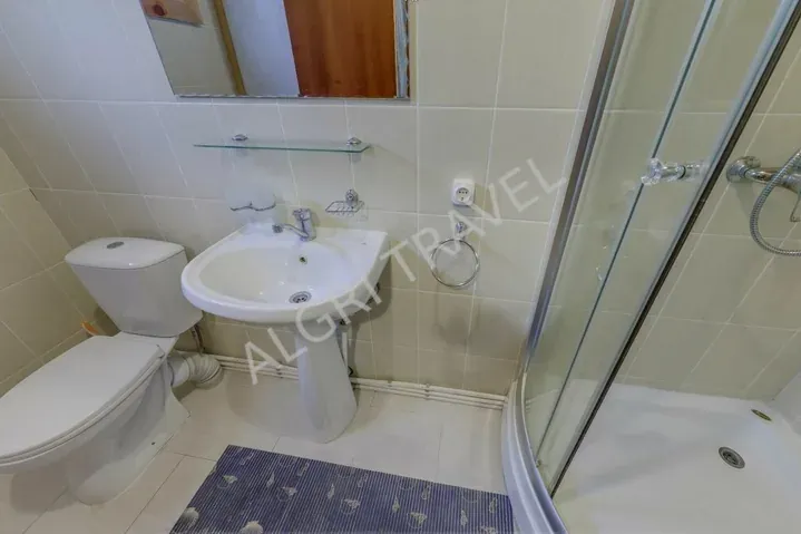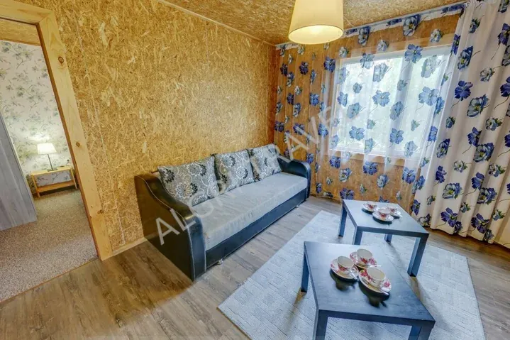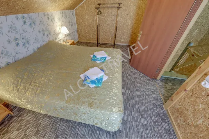 На первом этаже находится гостиная с диваном, изолированная спальня (отделена дверью) и душевая комната. На втором этаже — две отдельные спальни и дополнительный санузел с душевой. Такое зонирование особенно удобно для большой семьи или компании друзей.